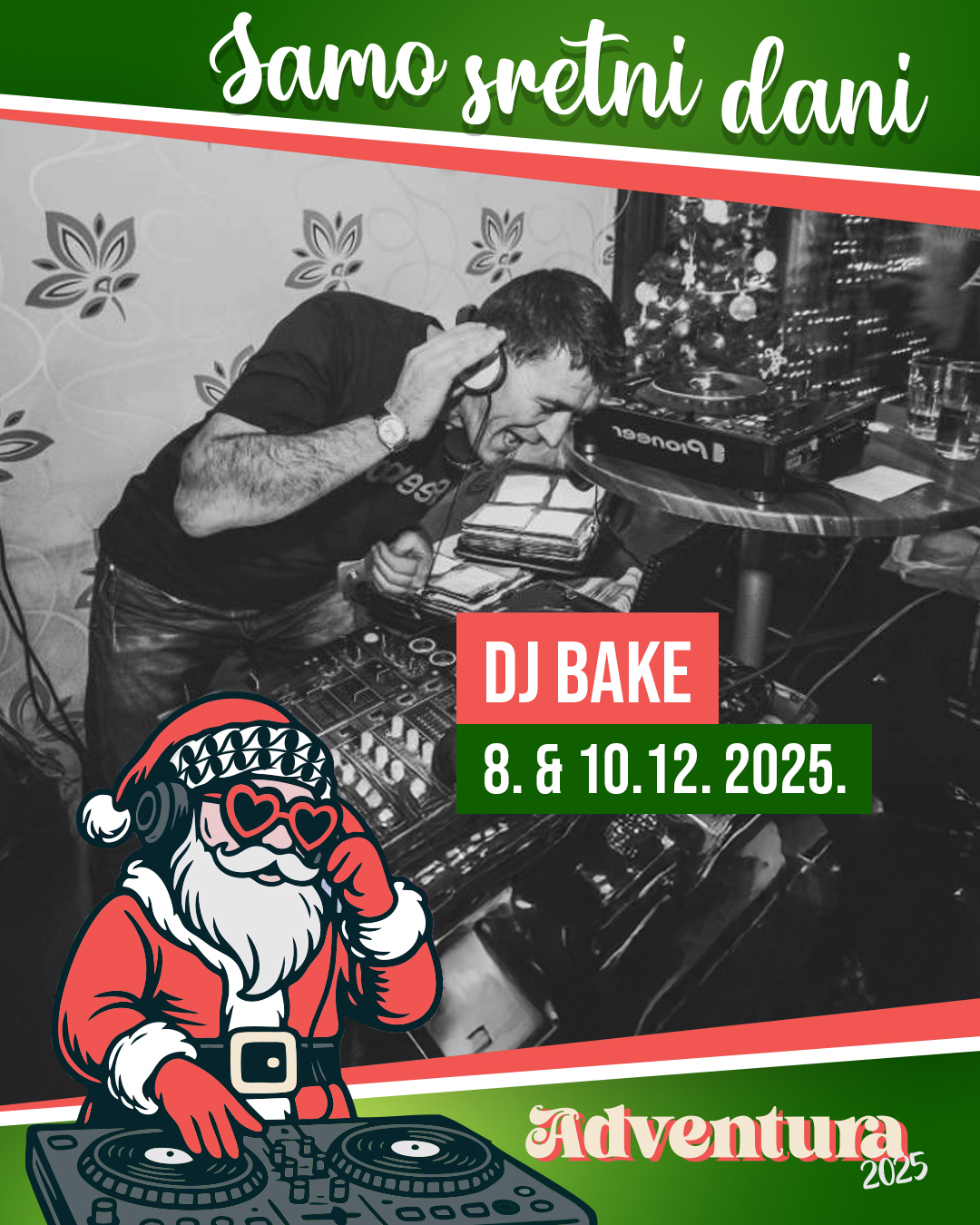 Pripremite se za vrhunsku atmosferu jer na Adventuri 8. i 10. prosinca nastupa DJ Bake – Jadran Bakula, jedan od najpoznatijih dalmatinskih DJ-eva s najdužom karijerom! Njegovi setovi garantiraju ples i odličnu zabavu, a ritmovi koje donosi podižu energiju na najvišu razinu.