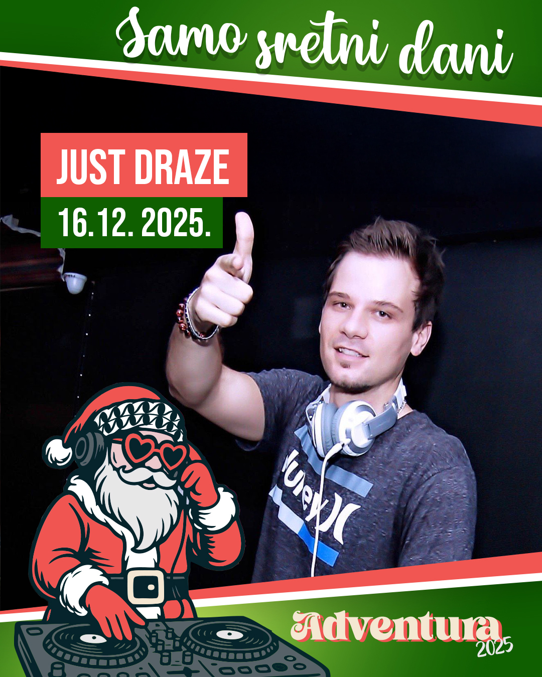 Naš Šibenčanin Just Draze 16. prosinca donosi vrhunsku glazbenu čaroliju na Adventuru! S više od 20 godina međunarodnog iskustva, od Azije do Europe, ovaj DJ majstor poznat je po stvaranju atmosfere koja pokreće baš svaki kutak publike. Očekujte savršeni miks funka, soula i bezvremenskih klasika, začinjen iznenađujućim glazbenim twistovima – za male i velike!